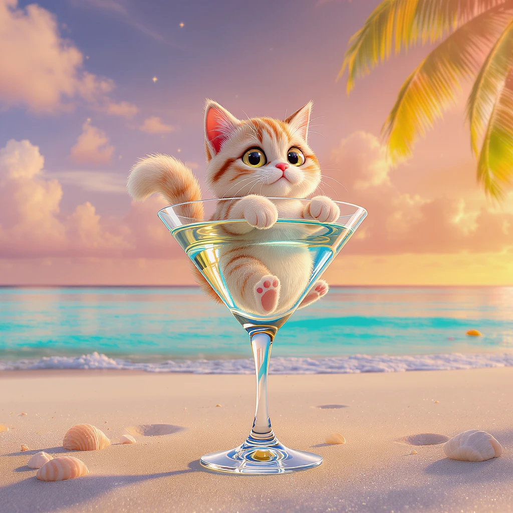 A stunning, cinematic masterpiece in ultra-realistic 8K resolution, featuring a cute, animated cartoon cat with soft fur and expressive eyes, sitting gracefully in an oversized, transparent martini glass. The cat is facing sideways, with its fluffy tail curled elegantly around the glass, one paw resting playfully on the rim. The martini glass is filled with crystal-clear water, creating gentle ripples and charming reflections. It stands firmly on the soft, white sand of a Maldives beach. The turquoise ocean stretches into the distance, with gentle waves lapping nearby. Palm trees sway softly in the breeze. The warm golden light of sunset illuminates the scene, casting glowing highlights on the fur, glass, and ocean surface. The sky is painted in shades of orange, pink, and lavender, with fluffy clouds glowing from the setting sun. Seashells, soft footprints, and glistening grains of sand in the foreground add realism and charm. A peaceful, magical atmosphere surrounds the entire scene. --ar 16:9 --style raw --v 6