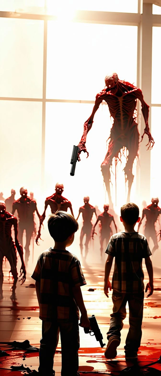 A boy and his dad looking from a window at daylight and sees many walking womem zombies . Their body are exposed and covered with blood . The dad holds a shotgun and shooting shots at them . Hyperrealistic. Hyper details . Hyper face and body details . 8k . High quality .