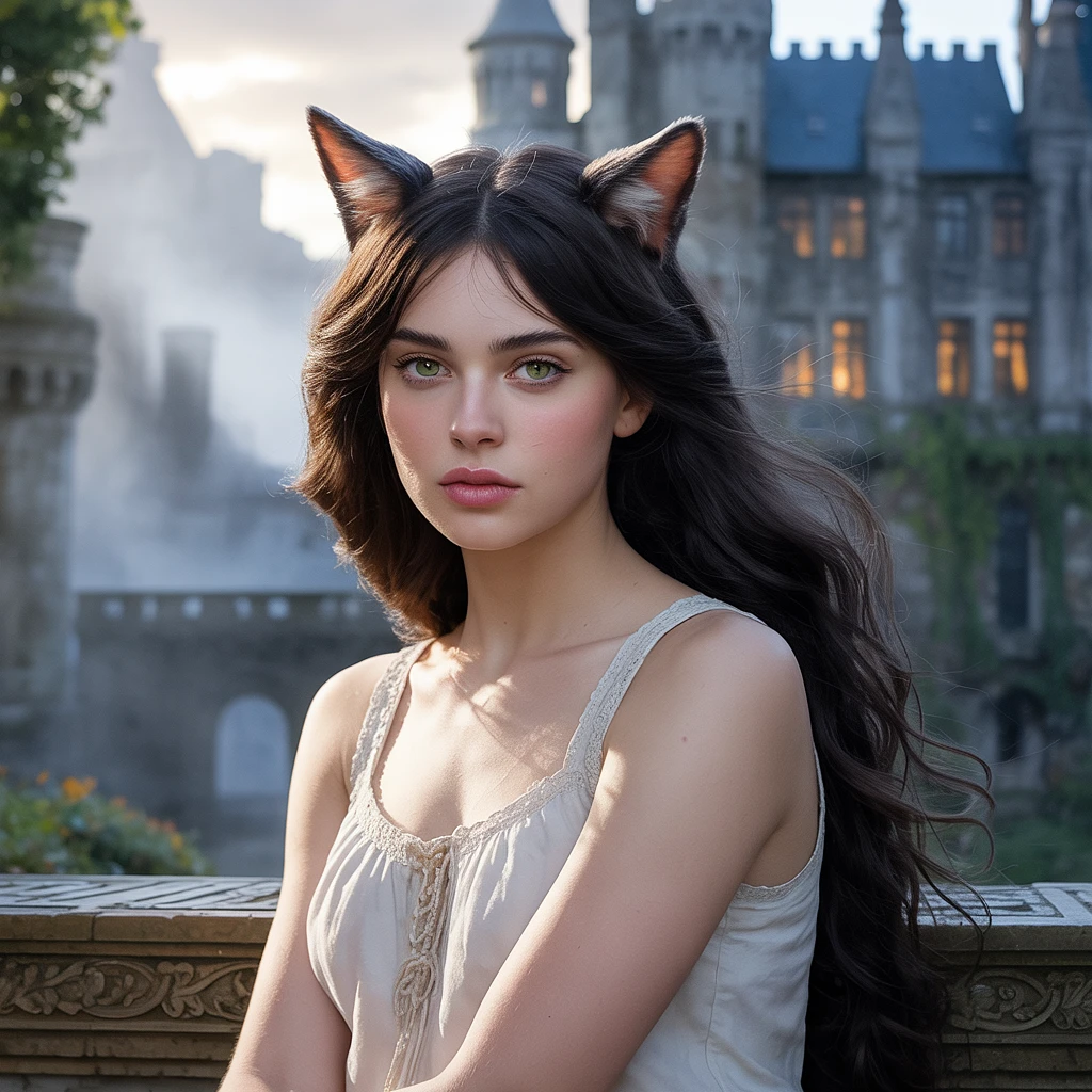 Masterpiece, the best quality, high-res, cat ears, black hair, castle background, green eyes, sitting on a bench