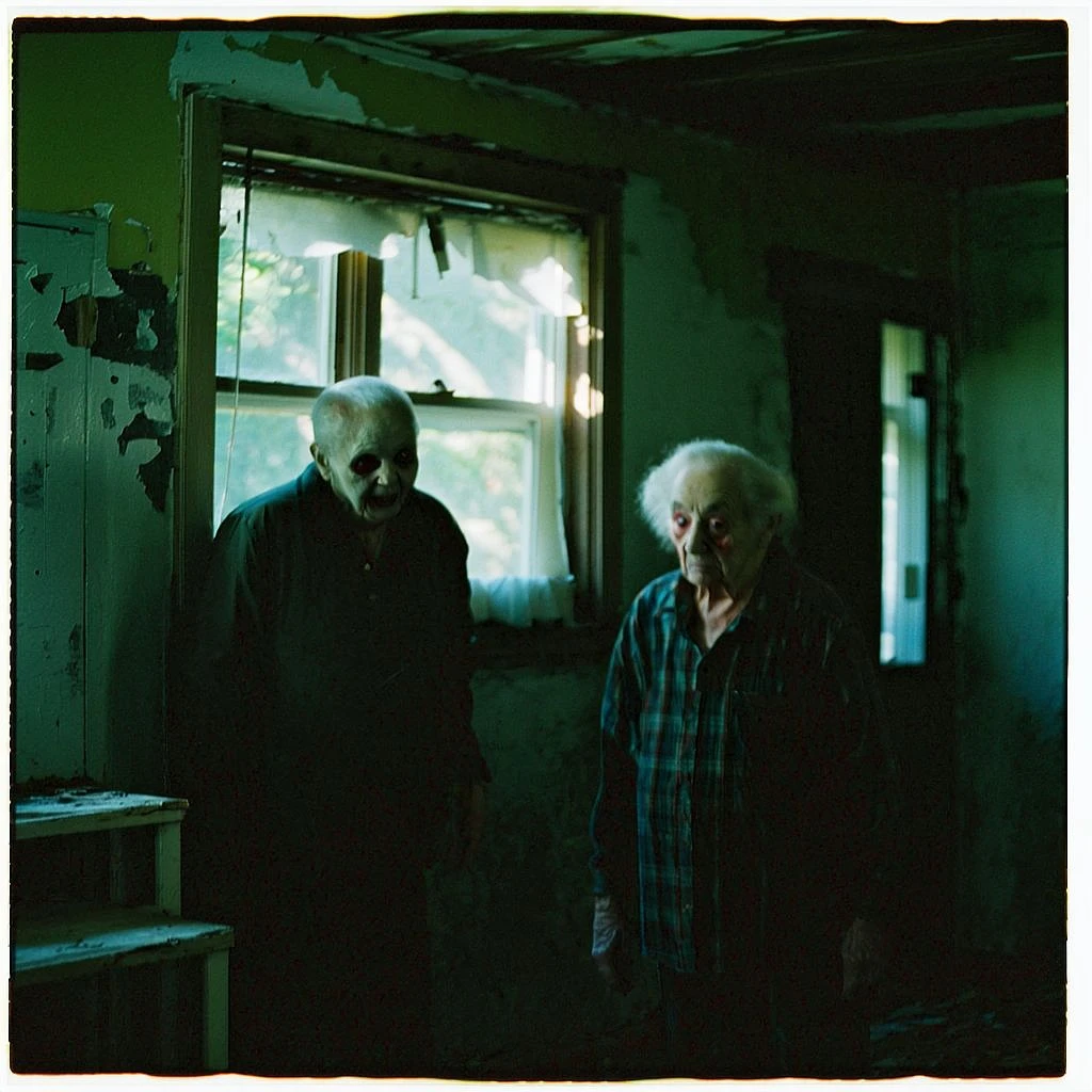 grainy 80's photograph quality polaroid really creepy old people caught in an abandoned house, dark, uncanny