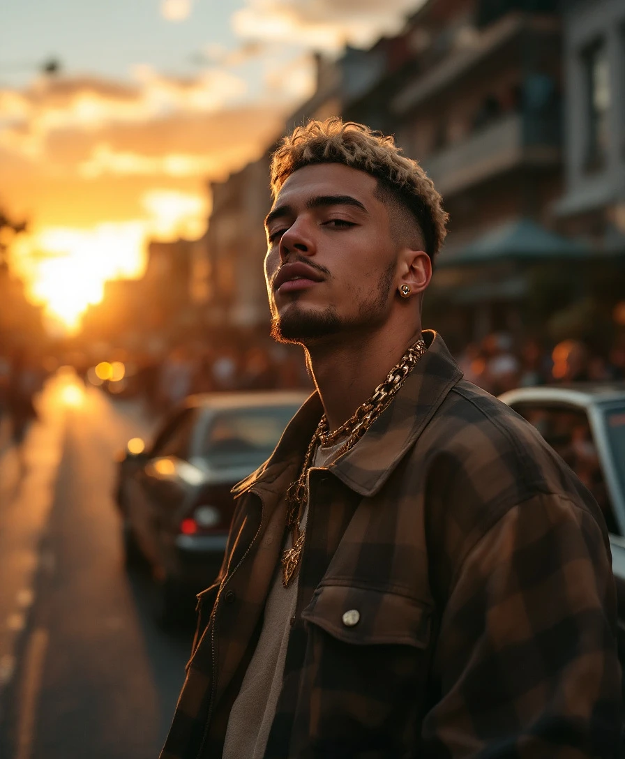 A white-skinned shorthair brunette rapper stands near the cadillac confidently on a vibrant urban street. The sun sets, casting a warm golden glow, while a crowd gathers, captivated by his powerful lyrics.