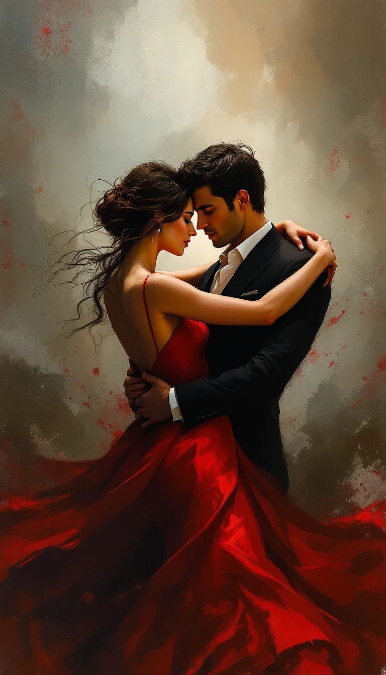 A passionate couple embraces closely in a romantic dance, locked in a deep, emotional moment. The woman wears a vibrant red, form-fitting dress that flows elegantly with painterly textures, while the man is dressed in a classic black suit and white shirt. Their faces are close, foreheads touching, eyes closed in intimate focus, conveying a powerful connection. The background is abstract, filled with expressive brushstrokes in soft grays, browns, and muted reds, enhancing the dramatic and artistic quality of the scene.