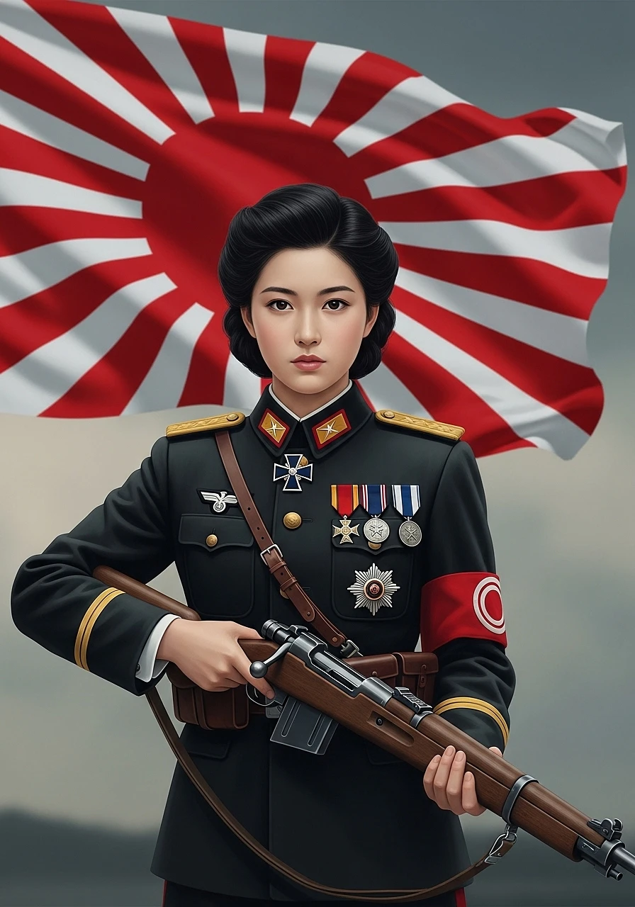 Paint a beautiful japanese army girl, black hair, japanese empire ww2 officer uniform , arisaka bolt action rifle with no magazin, japanese empire flag in background,