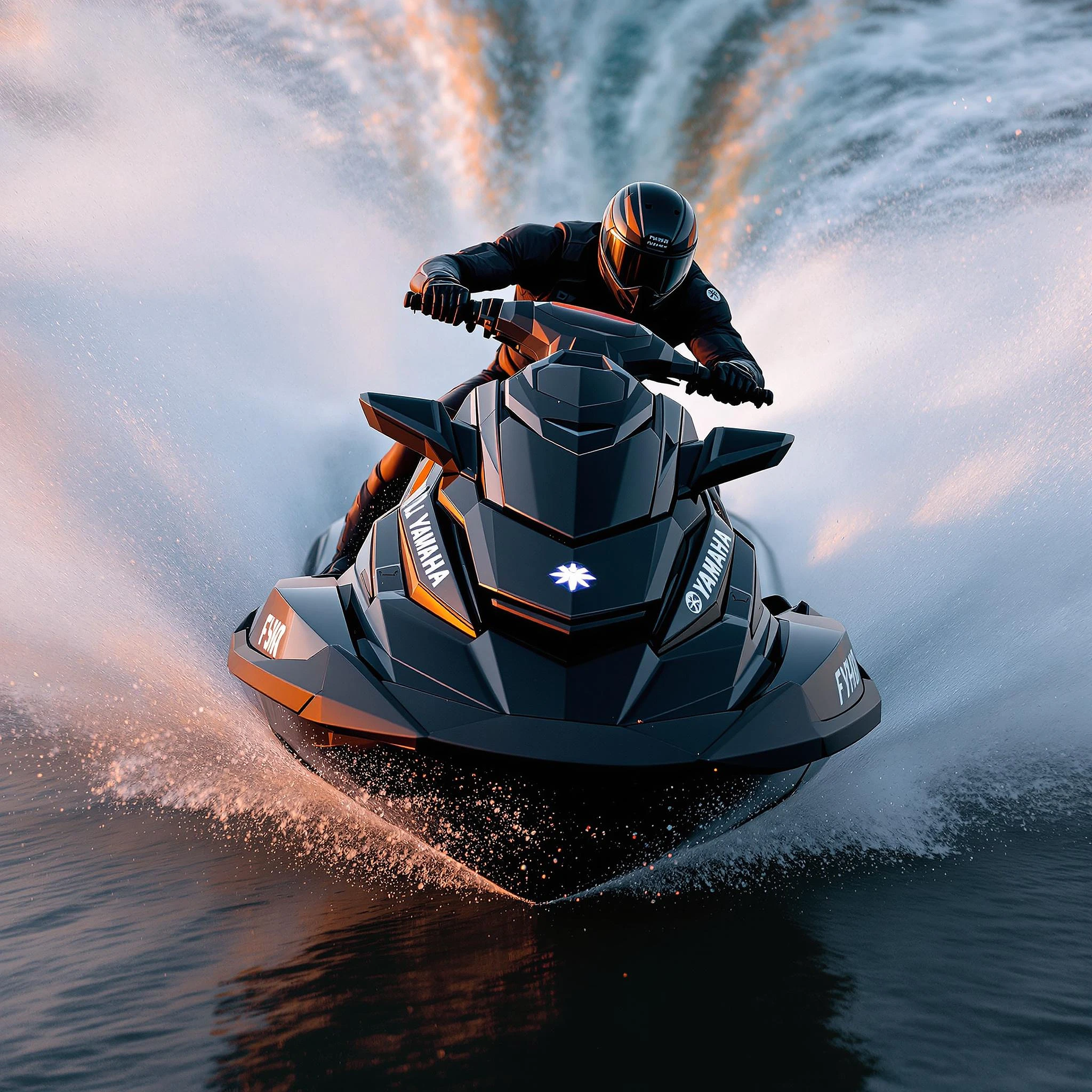 photography, sports shooting, dynamic range, dynamic motion with yamaha fx svho jetski black in color heading straight at camera