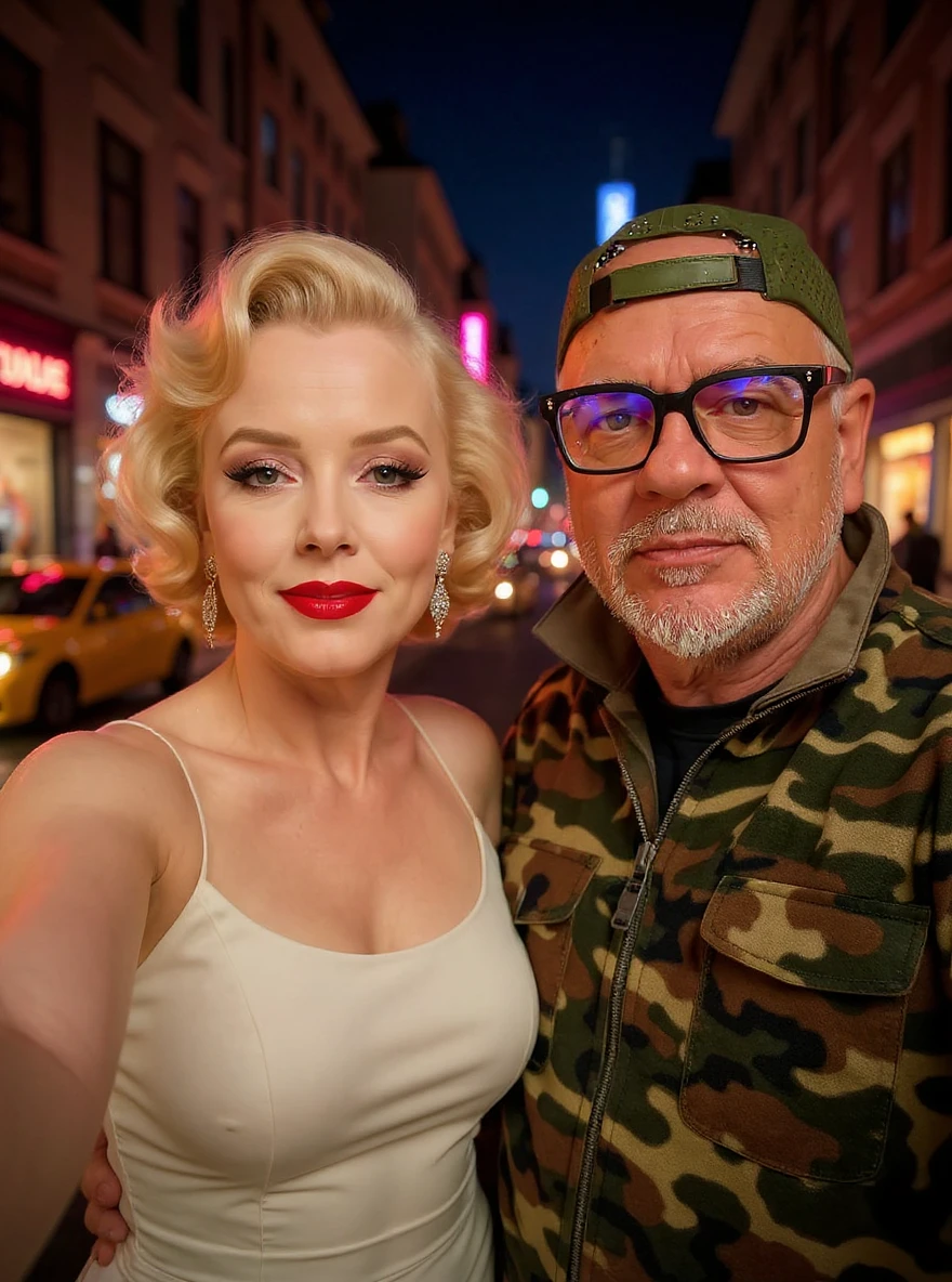 Ultra-realistic 8K selfie of Marilyn Monroe (around 30 years old, iconic Hollywood actress of the 1950s) and a 45-year-old middle-aged man (reference image provided) . Marilyn Monroe appears youthful and radiant, with platinum blonde curled hairstyle, flawless smooth skin, glamorous red lipstick, eyeliner, and sparkling drop earrings. She wears her famous white halter dress with natural fabric folds, perfectly illuminated by neon lights. Next to her is the 45-year-old man from the reference photo: glasses, short brizzled goatee, green military-style cap, camouflage zip jacket, natural facial expression, realistic age appearance without exaggerated wrinkles. Both are standing together on a vibrant neon-lit city street at night, cinematic atmosphere, blurred yellow taxis in motion, pedestrians in bokeh. Lighting: hyper-realistic, warm and dramatic with neon reflections on skin and glasses. Depth of field: ultra-sharp foreground, softly blurred background. Resolution: 8K ultra-photorealistic, professional lens rendering. you should rejuvenate the man by at least 10 years and he should be identical to the photoo. . . Marilyn should be 30 years old, she cuts the shot in 3:2 horizontal and widens the back background so that you can see the shops and a little street, they are too compressed in the frame! Ultra-realistic 8K wide-angle photo, 16:9 ratio. A 45-year-old man (reference image provided, youthful appearance for his age, smooth natural skin, no deep wrinkles, healthy look) takes a selfie with Marilyn Monroe (around 30 years old, radiant, flawless skin, platinum blonde curls, red lipstick, wearing her famous white halter dress) . Both are centered in the frame but with more space around them, leaving room to see the neon-lit city street in the background: glowing signs, shop windows, blurred pedestrians and taxis in soft focus. Lighting: cinematic neon glow with warm reflections on skin, realistic lens depth of field, ultra-sharp subjects in foreground, softly blurred background. Resolution: 8K UHD, professional full-frame lens rendering, hyper-realistic photography style.