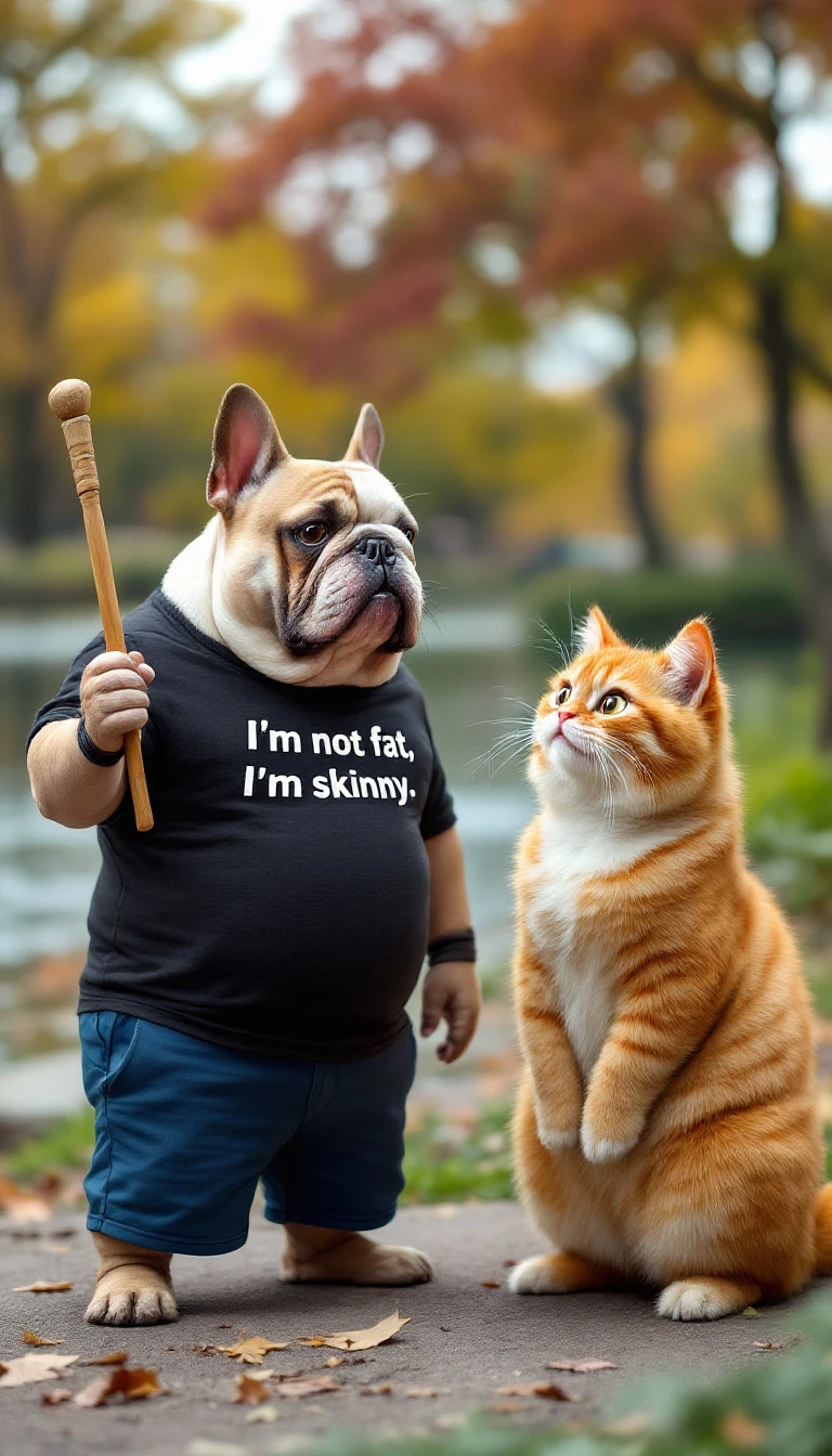 Standing is a fat French bulldog with light brown and white fur, one drooping ear, and large expressive eyes. He wears a tight black shirt that says "I'm not fat, I'm skinny", and short blue sports shorts. In an outdoor park by a river, he holds a wooden stick and waves it at a funny fat and huge orange cat with thick fur and white stripes, sharp brown eyes, and mischievous energy, and carries a small shoulder bag. His fur puffs up funny when he gets shocked, his mouth is open in surprise, and his tail is puffed up. The background is lively.