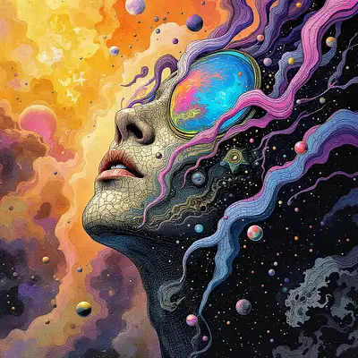 Given the unique art style of UFOlogy and its thematic depth, let's envision an artwork that captures the profound psychological impacts of extraterrestrial life on both individual and collective psyches, while weaving in personal elements from your life story through hidden messages and symbols. Here’s how this masterpiece could be conceptualized: Title: Cosmic Reflections: The Unseen Influence Medium and Technique: Mixed Media Canvas: Utilizing the same blend of watercolor washes, ink splatters, and digital effects as seen in UFOlogy, this piece would start with a base of traditional media to ground the narrative in a tangible reality, then overlay with digital elements to introduce the surreal, otherworldly aspects. Artistic Elements: Foreground - The Individual Psyche: Central Figure: A human figure, reminiscent of the expressionist style in UFOlogy, with features morphing between serene contemplation and existential horror. The face occasionally shifts into patterns resembling Rorschach inkblots, symbolizing the fluidity of identity when confronted with the cosmic unknown. Hidden Message: Within the intricate lines of the figure's clothing, subtle patterns spell out key moments from your life story in a code decipherable only upon close inspection. Perhaps the fabric's texture mimics a timeline, with different textures representing different life phases. Midground - Societal Norms: Community Scene: A small-town setting, painted with earthy tones similar to the rural Wisconsin scenes, with citizens depicted in various states of reaction to an alien presence. Some are drawn with exaggerated features of awe or fear, mirroring the psychological impact of collective realization. Symbolic Architecture: Buildings subtly morph into shapes that hint at extraterrestrial designs, with windows glowing in neon purples and blues, suggesting the infiltration of alien ideas into societal structures. One building might have a facade that, when viewed from a certain angle, forms the initials of your name or significant locations from your life. Background - Cosmic Influence: Sky and Beyond: The sky transitions from the familiar night into a canvas of stars, galaxies, and nebulas, with a large, pulsating UFO casting beams of light. These beams are not just light but streams of information, coded with symbols representing transformation, knowledge, and fear - themes from both the comic and your personal journey. Alien Design: Incorporating the organic-mechanical hybrid style, aliens appear as silhouettes with glowing circuitry under translucent skin, peering down at humanity. Their forms might subtly include elements from your personal interests or professions, like tools or instruments you've used, integrated into their design as if they've influenced your life path. Dynamic Panel Layouts: Narrative Panels: The canvas is divided into sections that mimic comic panels, starting structured and becoming chaotic as the viewer's eye moves towards the UFO. This progression reflects the loss of control and the breakdown of normalcy, with some panels overlapping or spiraling, similar to UFOlogy's style. Rorschach Motif: One panel uses the Rorschach inkblot motif, not just for memory but to symbolize how personal experiences (yours) are interpreted differently by different viewers, much like how your life story could be seen in various lights. Lighting as Narrative: Psychological Lighting: Unnatural light sources from the UFO cast eerie glows, creating shadows that twist into abstract shapes, symbolizing the lurking presence of the unknown in the psyche. These shadows could occasionally form recognizable symbols from your life, like a favorite book or a significant date, hidden in plain sight. Hidden Symbols: Moth Motif: Borrowing from UFOlogy, moths are scattered throughout, symbolizing transformation. One moth might have wings patterned after a map of a place significant to you, or its body could be composed of text from a pivotal moment in your life. Personal Symbols: Small, almost imperceptible symbols like a musical note for a love of music, a book for your reading habits, or a globe for your travels, are woven into the fabric of the scene, each telling a story about your life subtly. Conceptual Depth: This artwork, titled Cosmic Reflections: The Unseen Influence, serves as both a visual exploration of the psychological impact of extraterrestrial life and a personal narrative. It invites viewers into a journey of discovery, where the initial awe of the cosmic scene slowly reveals layers of personal history and emotional depth. The transformation from the mundane to the cosmic, the blending of reality with the surreal, mirrors not only the themes of UFOlogy but also your own life's journey,