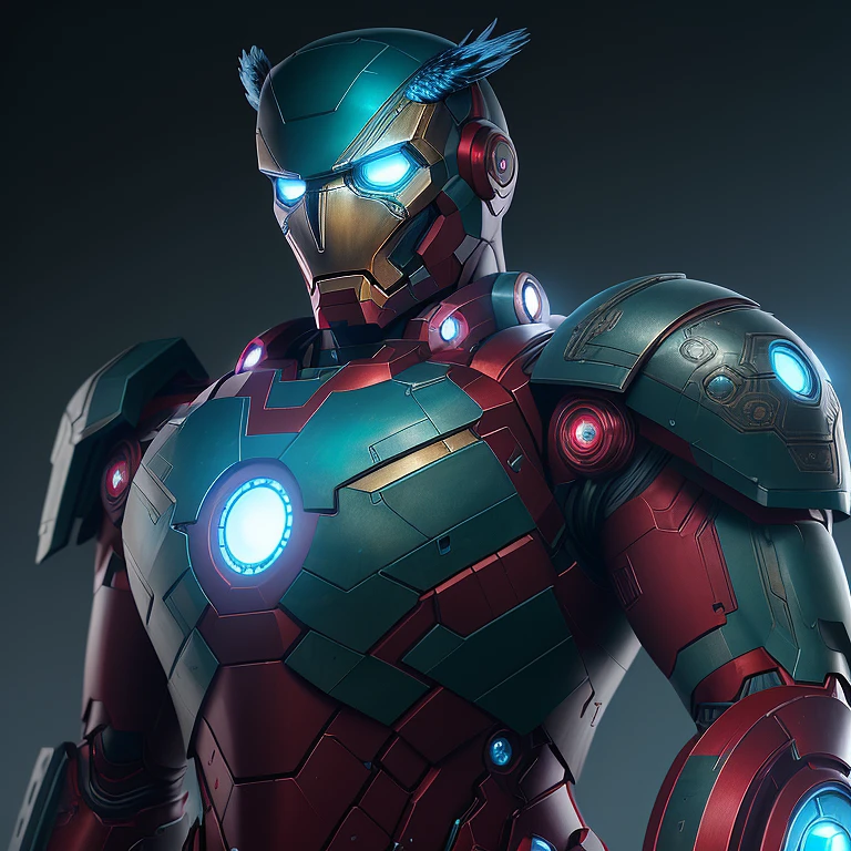 Anthropomorphic blue owl, hyperrealistic futuristic soldier wearing cyberpunk iron man jacket, big green eyes, lots of details, portrait, finely detailed armor, cinematic lighting, intricate filigree metal design, 8k, unreal engine, octane render, realistic, redshift render
