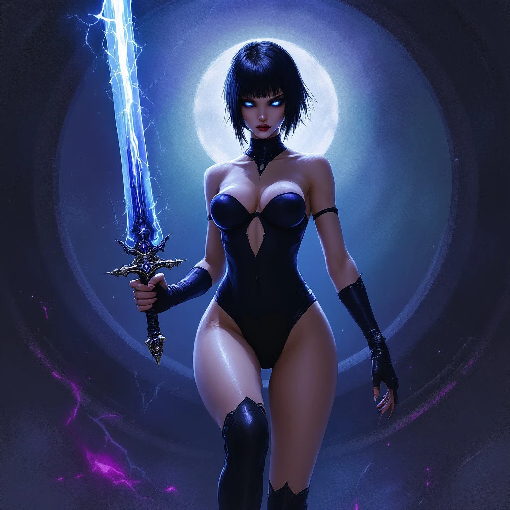 minimalistic painting in the style of warhammer 40k of a female petite tinytits psyker, standing infront a gothic circh, holding a sabre with blue lightning, cybereyes, black ultra tight onepiece bathsuit, black sidecut hair, tiny tits