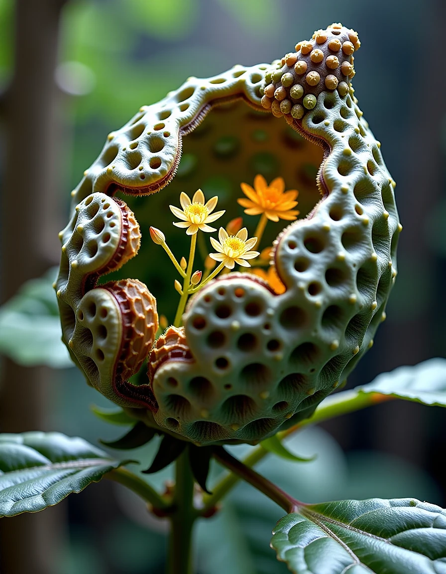 Bio-engineered seed pod, its exterior a tough, fractal-patterned husk, slightly cracked to reveal glowing, alien flora within. Sci-fi, botanical illustration style. ​​​