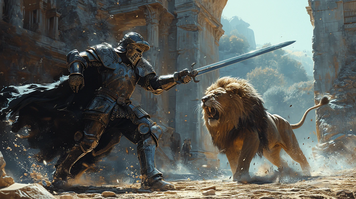 Colosseum, white fitted knight, with a sword, in action swinging pose fighting against lion --ar 16:9 --stylize 750 --v 6. 0