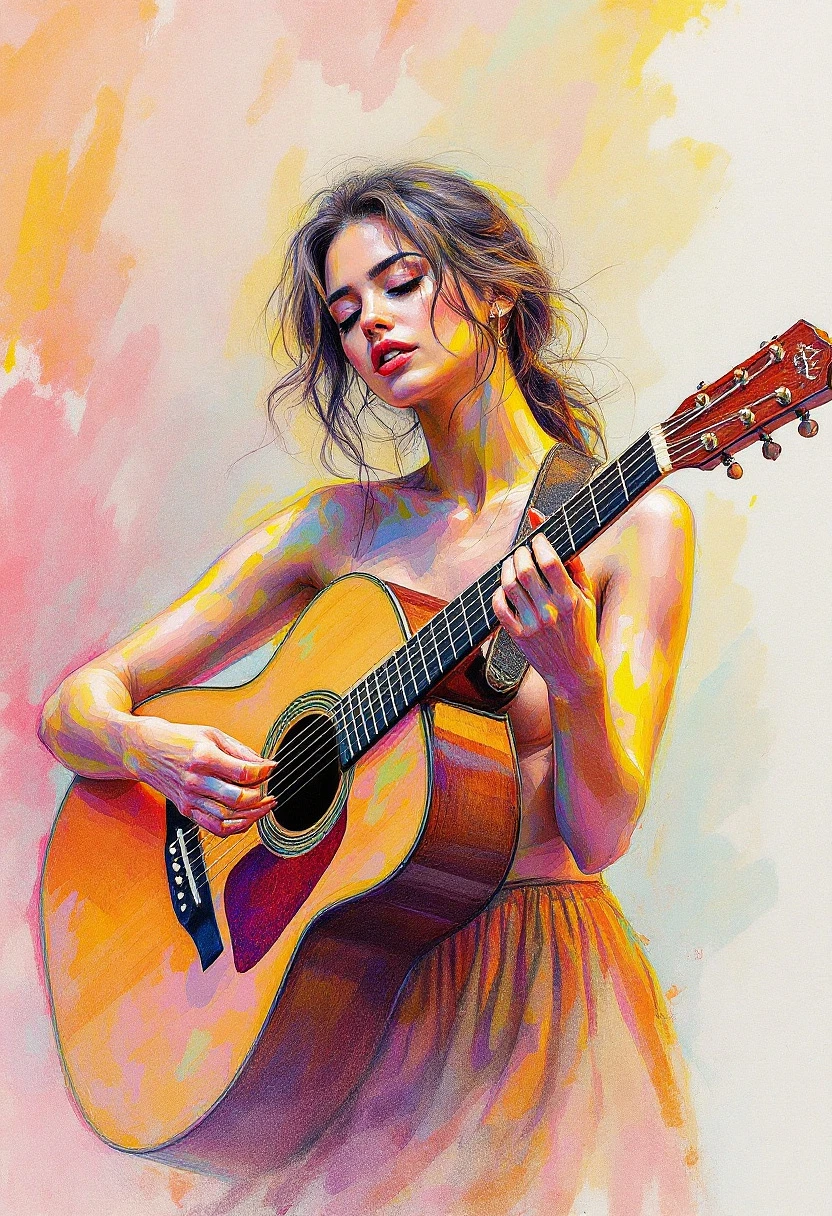 Sketch Art, Beautiful Colored Pencil Line, Artistic Brush Strokes, Beautiful, Woman Playing Guitar, Open Shoulders, Emotional Music in Beautiful Painting Style, Perfect Composition, Incredible Detail and Beautiful Rendering, Trending on ArtStation, 8k Art Photography, Realistic Conceptual Art, Perfect Light in Natural Volumetric Cinematography, Soft Light and Shadows, Award Winning Photography, Masterpiece, Oil on Canvas, Raphael Caravaggio, Greg Rutkowski, Beeple Beksinski, Giger