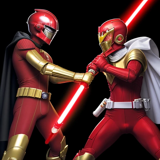 RED SPANDEX SUIT, WITH GOLD GLOVES AND BOOTS , wearing a RED ranger helmet HOLDING a lightsaber vs ANOTHER BLACK SPANDEX SUIT CHARACTER , WITH GOLD GLOVES AND BOOTS , wearing a black helmet and yellow cape HOLDING a lightsaber IN A SWORD FIGHT in space.