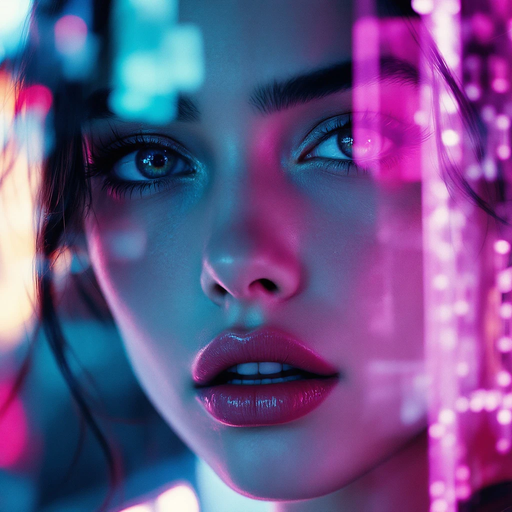 (masterpiece, digital art:1.3) , a highly detailed and intricate double exposure artwork, inspired by Yuumei's artistic style, showcasing a close-up of a woman's face. The image of the woman is centered in the middle of the composition, filling the entire screen, as the camera is positioned slightly from below, offering a low-angle shot. Her facial expression is intense and alluring, with her mouth slightly open in a lascivious, sensual manner, while her wide-open eyes draw the viewer in with an almost hypnotic gaze. The focus is on the mesmerizing allure of her face, which dominates the image, with every minute detail of her features sharply captured in high-definition clarity. The composition of her face is carefully balanced, with soft lighting accentuating her features, such as the contour of her cheekbones, the delicate arch of her eyebrows, and the fullness of her lips. Her eyes gleam with an otherworldly intensity, illuminated by the vibrant neon lights surrounding her. The slight opening of her mouth adds a sense of provocative allure, subtly hinting at mystery and seduction. The woman’s face, with its striking yet minimalist design, feels both futuristic and sensual, enhanced by glowing tech-inspired elements that hint at her connection to a digital, cyberpunk world. Surrounding her face, the background is an immersive, full-screen digital scene, drawing heavy inspiration from the graphic aesthetic of early 90s UK rave flyers. The entire design pulsates with neon energy, with sharp, angular lines forming complex geometric patterns that dynamically shift and vibrate around her. The background is not merely a static element; it interacts with the woman’s face through multiple exposure techniques, creating a seamless blending of human form and digital chaos. The full-screen image is alive with motion, as the techno beat of the rave scene seems to flow through every pixel, syncing perfectly with the visual rhythm of the design. The vibrant colors of the background burst in technicolor hues—electric pinks, lime greens, electric blues, and neon purples—flooding the scene in waves of light. These colors not only illuminate her face but also create an atmosphere that feels both energetic and dream-like, evoking the surreal quality of a rave. The graphic elements are overlaid with circuit board etchings, sleek lines, and abstract, flowing waveforms that mimic the energy of an audio visualizer. These lines seem to ripple and undulate, synchronizing with the beat of the techno, creating a sense of dynamic motion within the static image. The tech-inspired elements are layered and complex, adding a depth to the scene, creating the feeling that the woman’s face is both part of and surrounded by a digital, futuristic world. The rave aesthetic is further emphasized through the incorporation of classic 90s rave flyer elements. Bold, fluorescent light trails snake around her face, giving the design a sense of fluid motion, as if the scene were captured in a moment of intense, high-energy movement. The iconic acid house smiley faces are subtly integrated into the background, glowing softly in neon yellow, adding to the nostalgic feel. Checkered patterns, reminiscent of rave flyers, are interspersed throughout the design, creating a hypnotic, rhythmic backdrop. Abstract graffiti and distorted text effects further enhance the chaotic, anarchic vibe of the scene. In the lower portions of the image, elements like cassette tapes and vinyl records appear, broken and scattered across the scene, nodding to the rave culture of the 90s. These elements are digitally fragmented and distorted, almost merging with the design’s background to create a glitch-like effect. Acid house symbols like the “X” and smiley faces are dispersed across the image, further emphasizing the underground, rebellious nature of the rave scene. Holographic grids shift in and out of focus, adding another layer of depth to the composition. These grids pulse, vibrating with the same energy as the audio waveforms, making the entire design feel as if it is alive with sound and light. Her face is surrounded by soft, glowing halo effects, with thin lines of neon running along the edges, enhancing her futuristic, digital aura. The intricate details of the circuit-like patterns etched into the background and along her face appear almost tactile, giving the design a three-dimensional quality. This merging of digital elements and human form creates a beautiful tension between the organic and the mechanical, the past and the future, making her face the focal point of the image while ensuring it is fully integrated into the surrounding digital environment. Every detail of the image is rendered in ultra-high-definition, from the fine textures of the glowing neon elements to the smooth, glossy finish of the woman’s skin. The meticulous detail brings the design to life, with each pixel contributing to the larger narrative. The overall atmosphere is one of vibrant energy, futuristic allure, and raw, unrestrained emotion, creating a visual narrative that draws viewers in and refuses to let them go. The integration of 90s rave elements, combined with the seductive intensity of the woman’s gaze, forms a unique and captivating piece that pulses with the spirit of both rave culture and the cyberpunk future.
