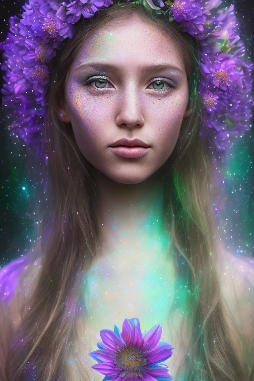 determined woman| (detailed face with iridescent paint) | (( iridescent eyeliner) )| vibrant bioluminescent purple background| hyperrealistic| Portrait of a young girl with a flower crown, in the style of natural light, Fujifilm X-T4, dreamy expressions, high contrast image, bokeh effect, impressionist art, pastoral influence.