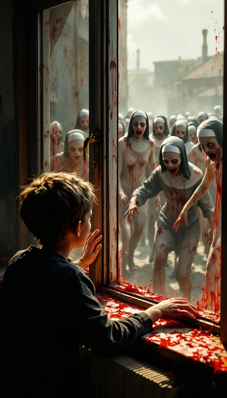 A boy looking from a window at daylight and sees many walking womem zombies . Their body are exposed and covered with blood . Many nuns zombies . Hyperrealistic. Hyper details . Hyper face and body details . 8k . High quality .