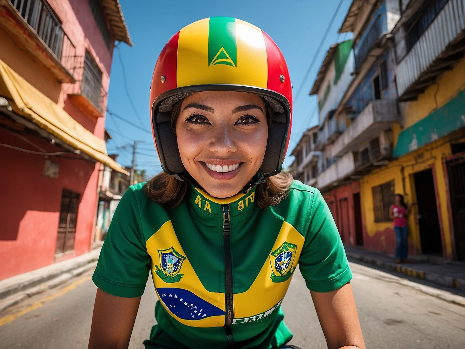 the brazilian flag is shown behind the helmet of a woman, in the style of candid photography, red and amber, samyang af 14mm f/2. 8 rf, whitcomb-girls, matte photo, berrypunk, outrun --ar 33:50 --v 6. 0