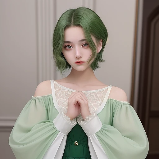 A very beautiful girl, 16 years old. She is cute and looks young. Her hair is green, short. She is lively and active. Smart and royal. She wears luxurious, elegant clothes and is modest, with a luxurious hairstyle.