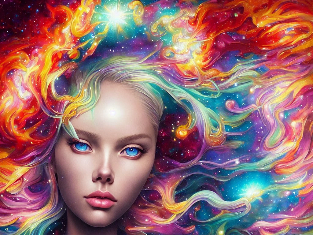 ultra realistic photo portrait of Scarlett Leithold cosmic energy, colorful, painting burst, beautiful symmetrical face, nonchalant kind look, realistic round eyes, tone mapped, intricate, elegant, highly detailed, digital painting, artstation, concept art, smooth, sharp focus, illustration, dreamy magical atmosphere, art by artgerm and greg rutkowski and alphonse mucha, 4k, 8k