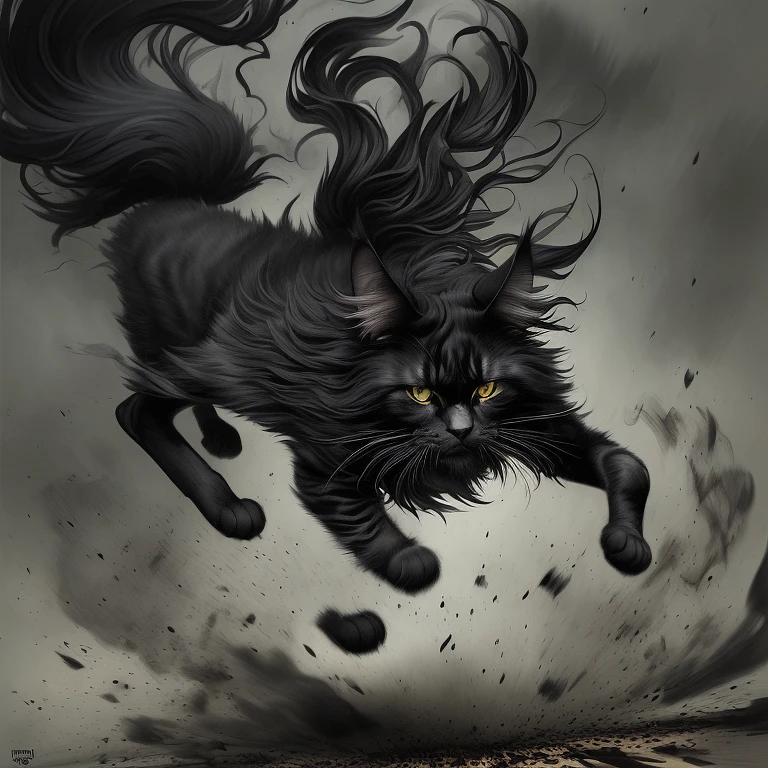 a black smoke maine coon in motion, elegant, intricate background, epic composition, dark tones, unforgettable, very intricate, in the style of Russ Mills and Milo Manara, visually captivating