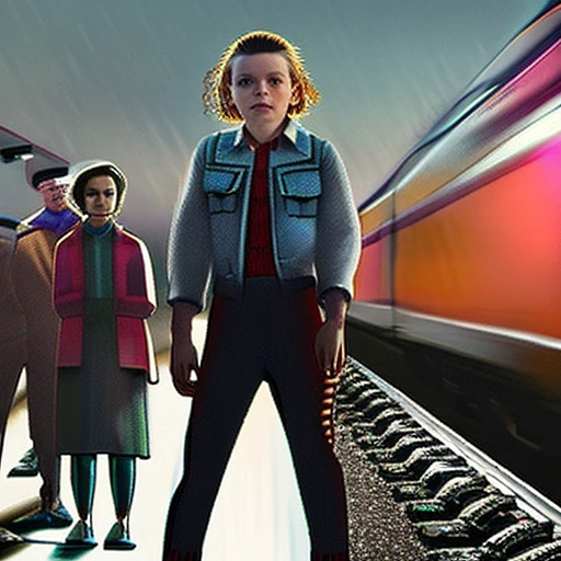 Eleven, the protagonist of the hit Netflix series 'Stranger Things', using her telekinetic powers, stands in front of a runaway train heading towards a group of innocent people. Describe the scene in which Eleven gathers all her strength to stop the train, detailing the concentration and effort on her face, the wind blowing her hair, and the reaction of the people as they watch the train come to a halt just in time.