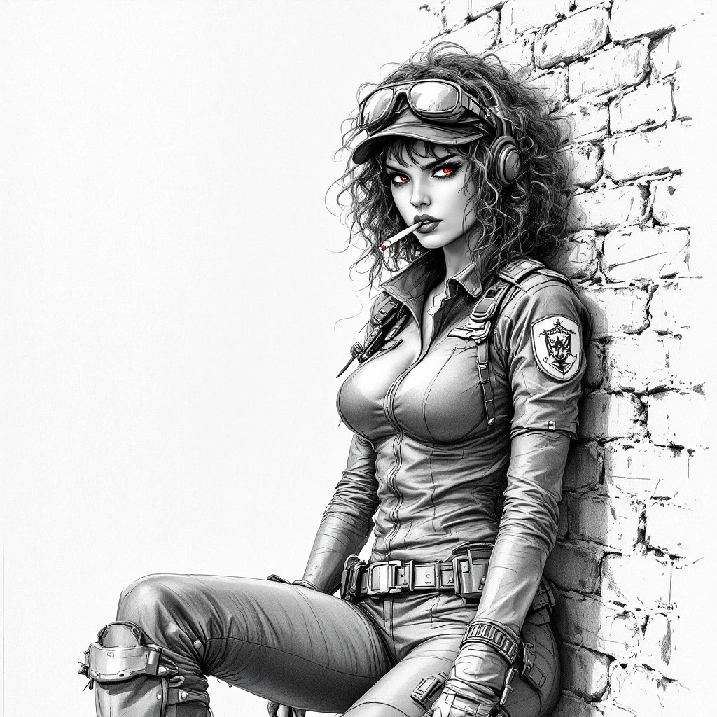 A very well done pencil sketch, just use some red color to give the main points of a full body cyberpunk female character, around the age of 20 leaning against a brick wall smoking a cigarette and looking away from the camera. They have an angry face. They should be wearing a police outfit and heavy boots and their hair is reminiscent of makima from Chainsaw man, but curly hair. like malin akerman as laurie jupiter