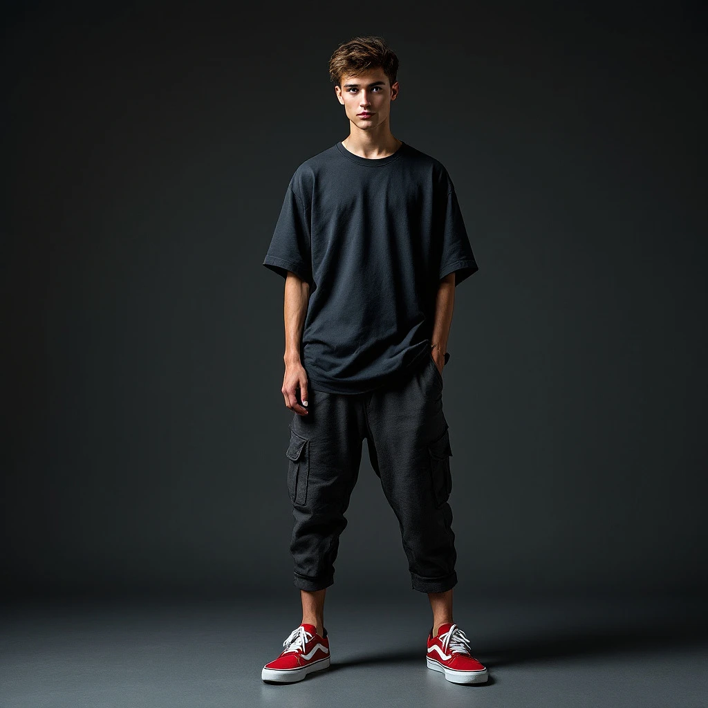 fashion photograph, front shot, full body, male model, gaze to front, provocative stare, short stylish hair, randomly gradation color loose fit T-shirt, muted dark grey capri pants, red color Vans oldschool sneakers, shot from the front, used camera is Canon EOS-1D X Mark III, set at a low angle to capture the pants form and detailing, aperture of f/5. 6 to focus on model, vibrant artistic darkness background, low-key, top-down pin light setting, high contrast, realistic, UHD, rich details --ar 9:16 --v 6. 1