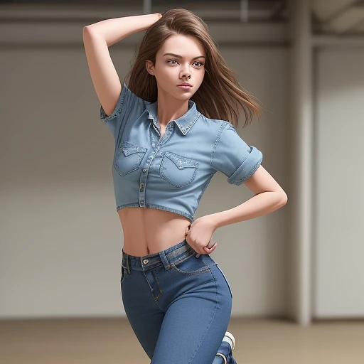 A young woman is captured mid-stride, stepping forward with her left leg, and her right leg behind. Her body is squared towards the viewer, arms resting naturally at her sides. She is dressed in high-waisted blue jeans paired with a denim shirt, both fitted, with the shirt buttoned up and sleeves rolled to the mid-forearm. A red patterned belt with a silver buckle adorns her waist. Her long hair is styled straight, flowing over her shoulder and back. Countryside background