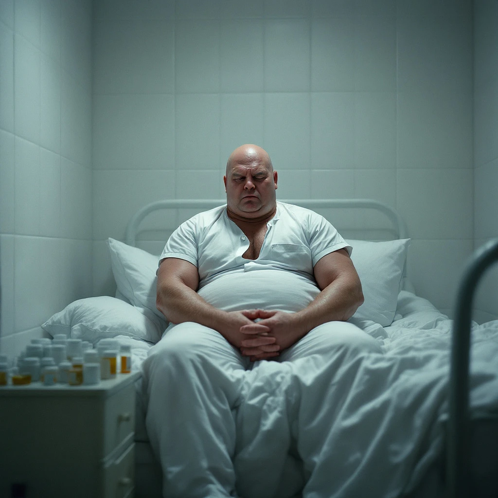 "A depressed and overweight He-Man sitting on the edge of a hospital bed, head slightly tilted downward, blank and lost expression, wearing white hospital pajamas. The room is completely white with padded walls, like a mental asylum. A small nightstand filled with various pill bottles in different sizes at the foot of the bed. The bed has a simple tubular metal headboard, 1970s hospital style. Cinematic lighting, dramatic shadows, hyper-realistic, moody atmosphere, highly detailed, 8k, depth of field. "