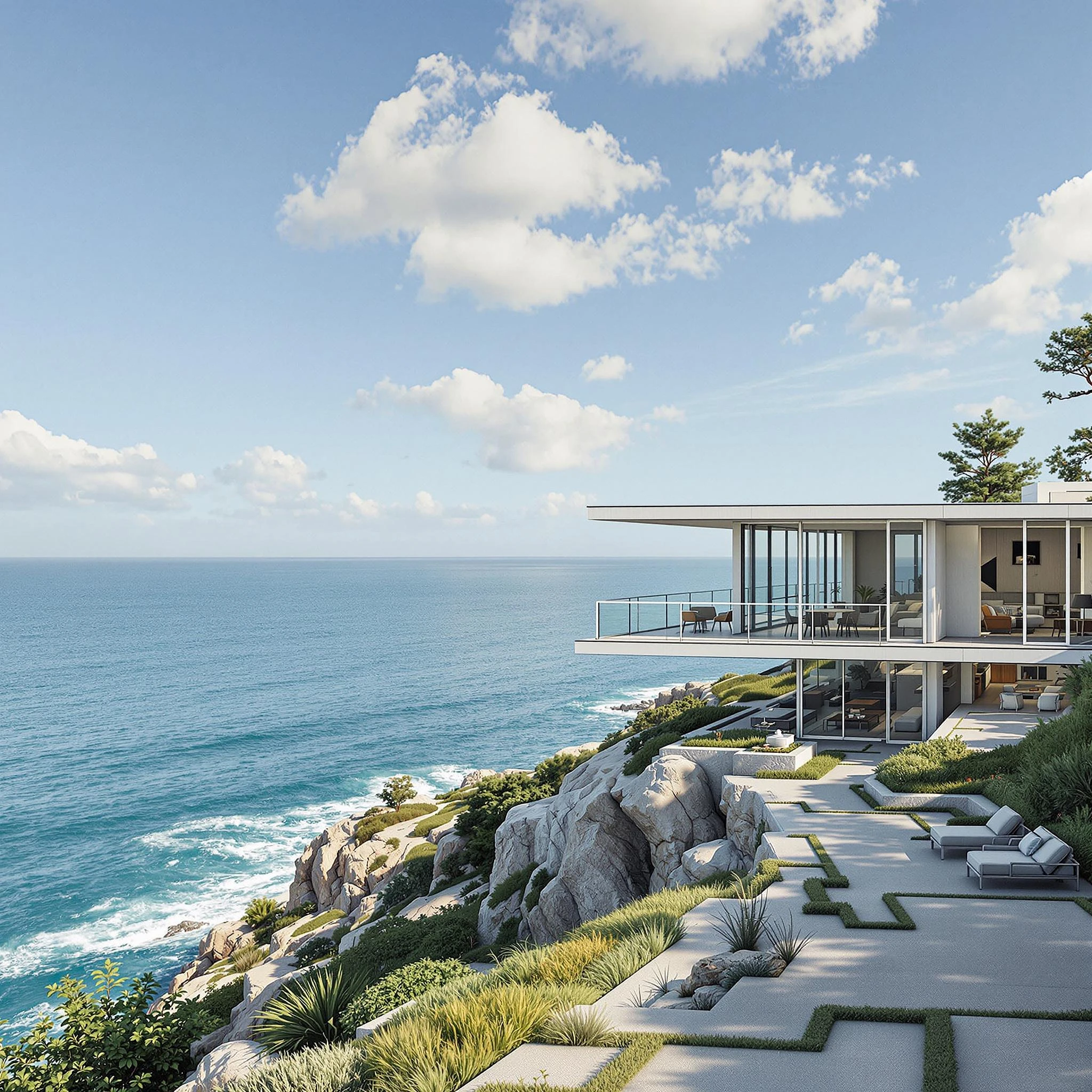 Hyper realistic eye level exterior photo of a mid century modern style house overlooking the ocean, daylight, indirect lighting, AD magazine, Frank Lloyd, Eames, Mies van der Rohe
