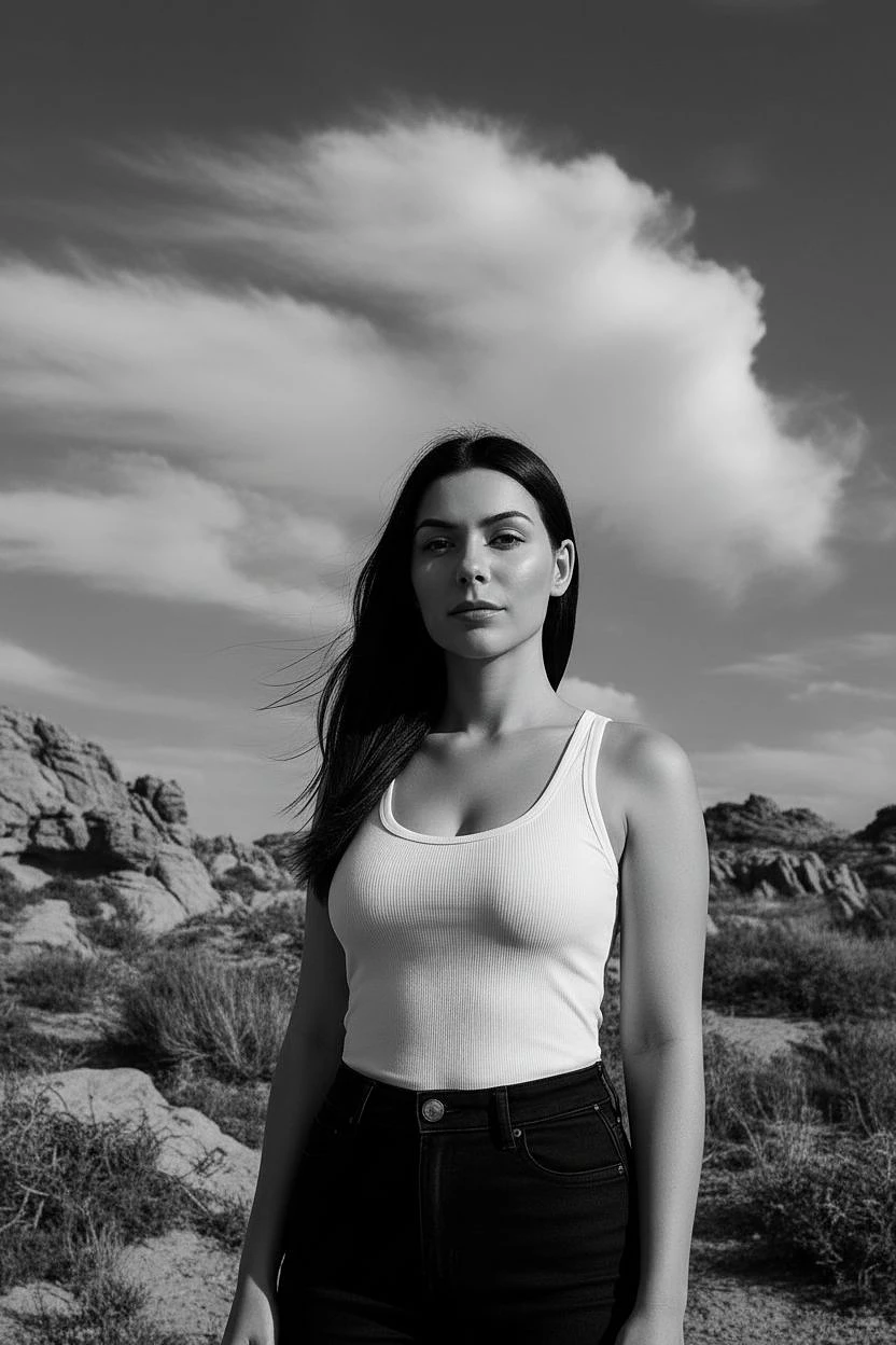 black and white photography, fashion editorial, a portrait of beautiful darkhaired woman in nature settings, dramatic sky, light and shadows, highres, realistic photo, professional photography, cinematic angle, dynamic light back shining,