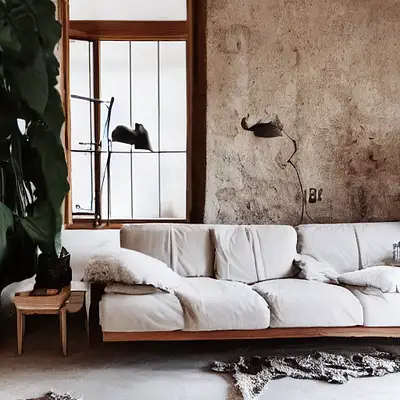 the interior in which there is only a sofa photos in high resolution the room is gray, wooden floor, large panoramic, overlooking the garden, sofa in Scandinavian style, high ceilings, pastel palette brown leather, cozy atmosphere, guitar next to the sofa