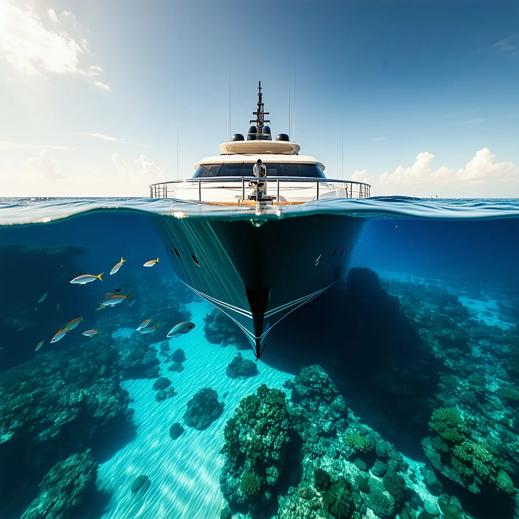 Cinematic scene, high definition, luxury super yacht sinking in crystal clear water, split over and under water view, reef fish swimming around sunken yacht, above water blurred land in the distance, sandy beach close by --ar 16:9 --s 750 --v 6 --style raw
