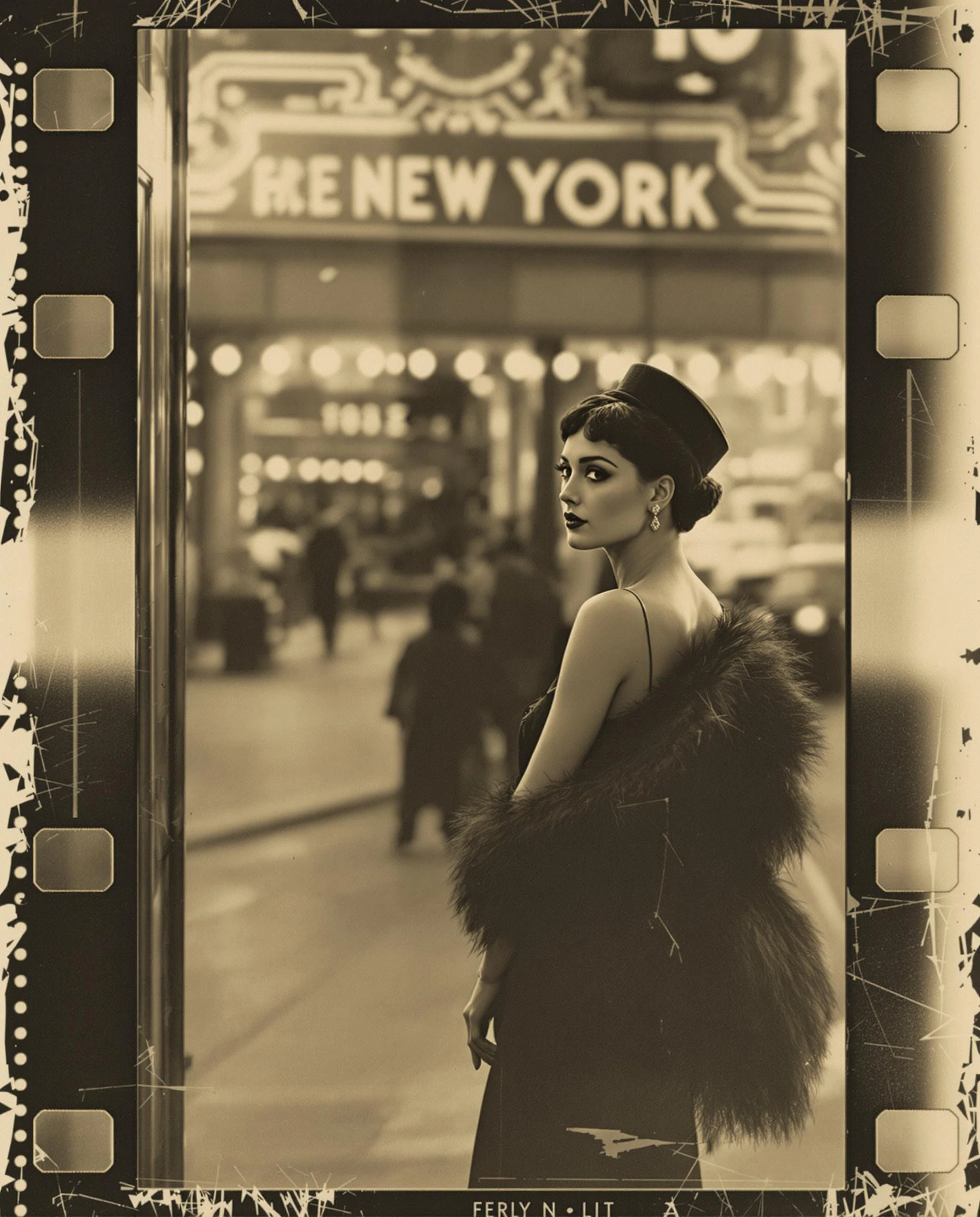 Style: old photographic film reel horizontal layout vintage art noir scratched film, beautiful woman wearing 1930's haute couture fashion, out the front of a movie theatre, 1930s new york street background, film edge along left and right side edge, sepia black and white vignette around edges, water stained