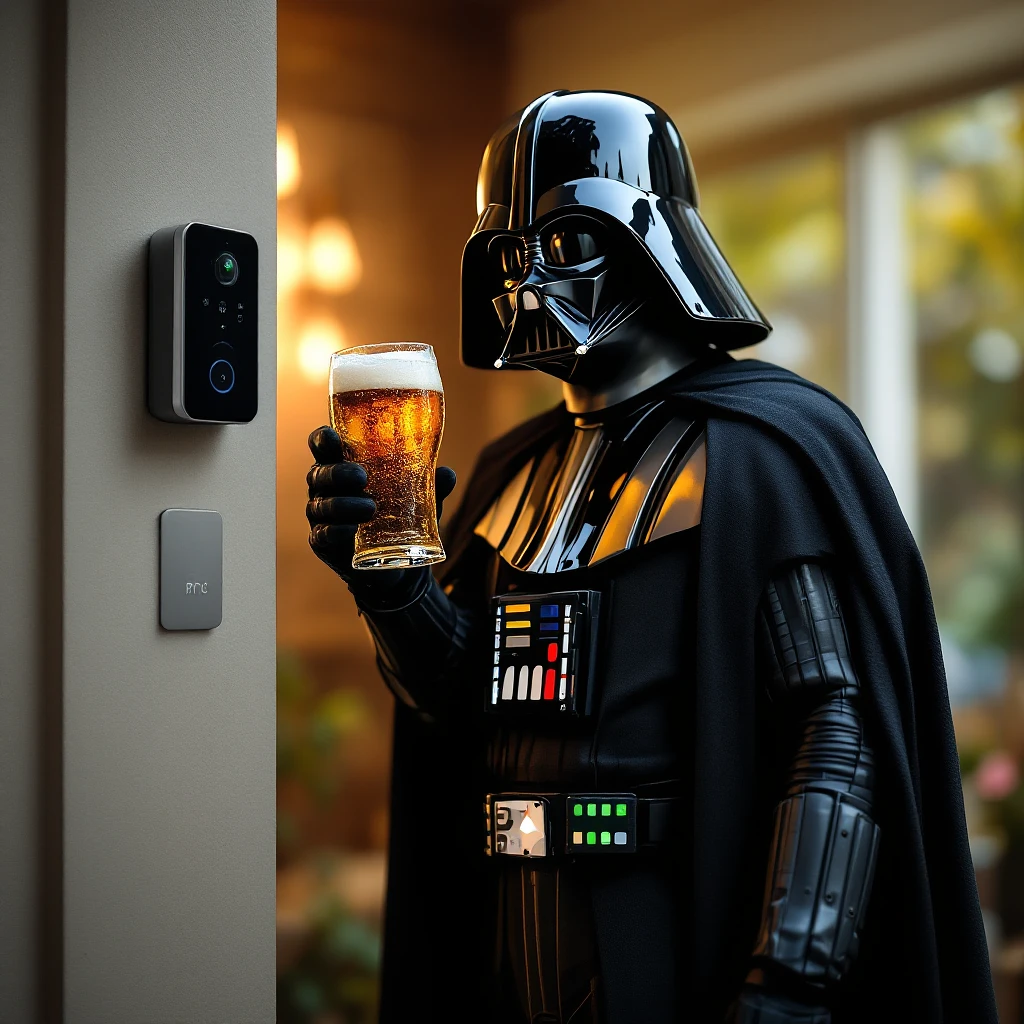 ring doorbell photo of darth vader with a keg of beer