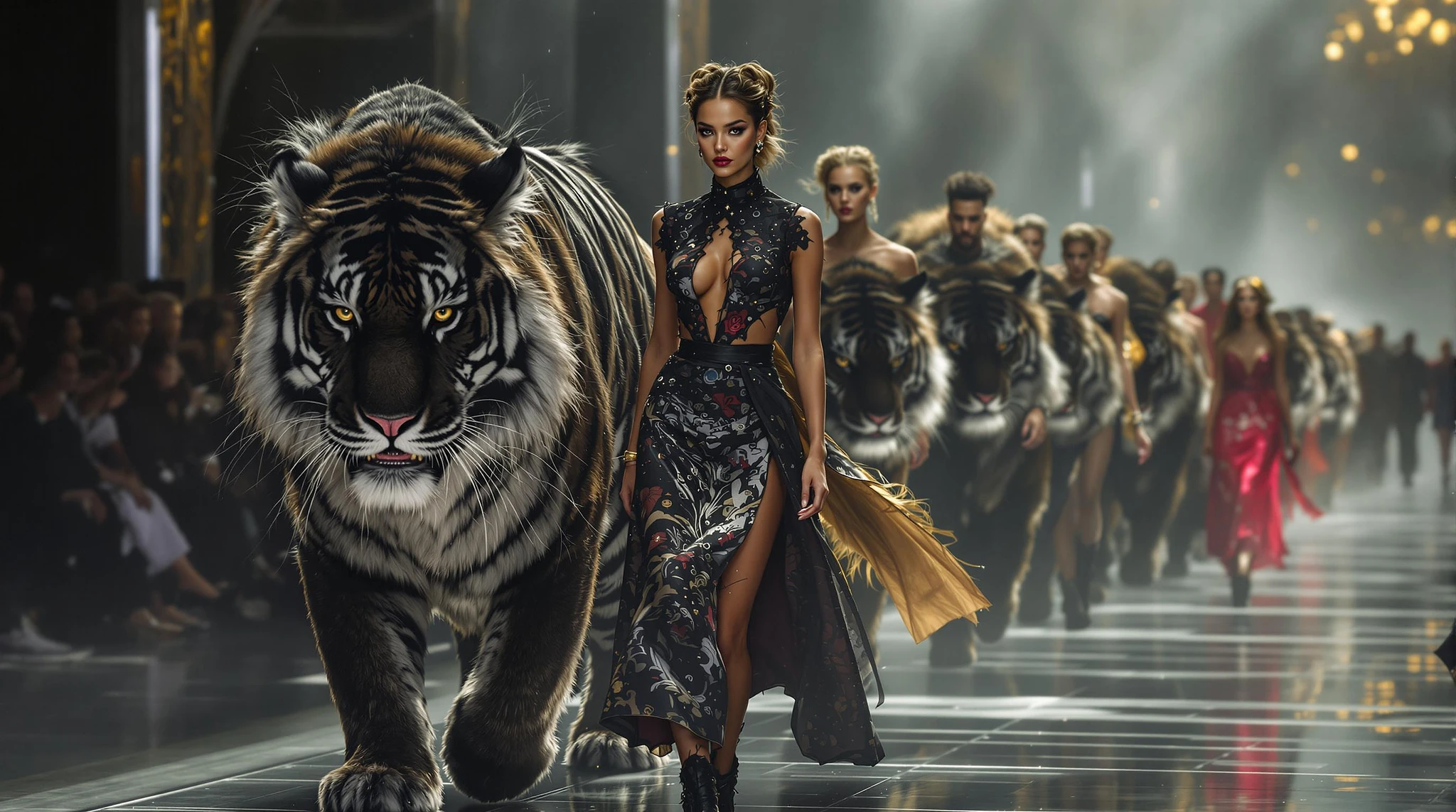 catwalk, fashion models, walking with huge felines black tigers, their clothings are in complementing the scene adding glamour and elegance, 8k very fine details and textures, spots lighting