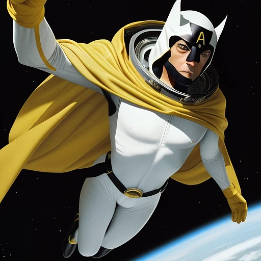 george clooney is wearing a white bodysuit with a wispy yellow cape, black mask connecting to his red and black emblem, power bands, and a power belt. Like many superheroes of the era, he has no visible pupils and is flying in space.