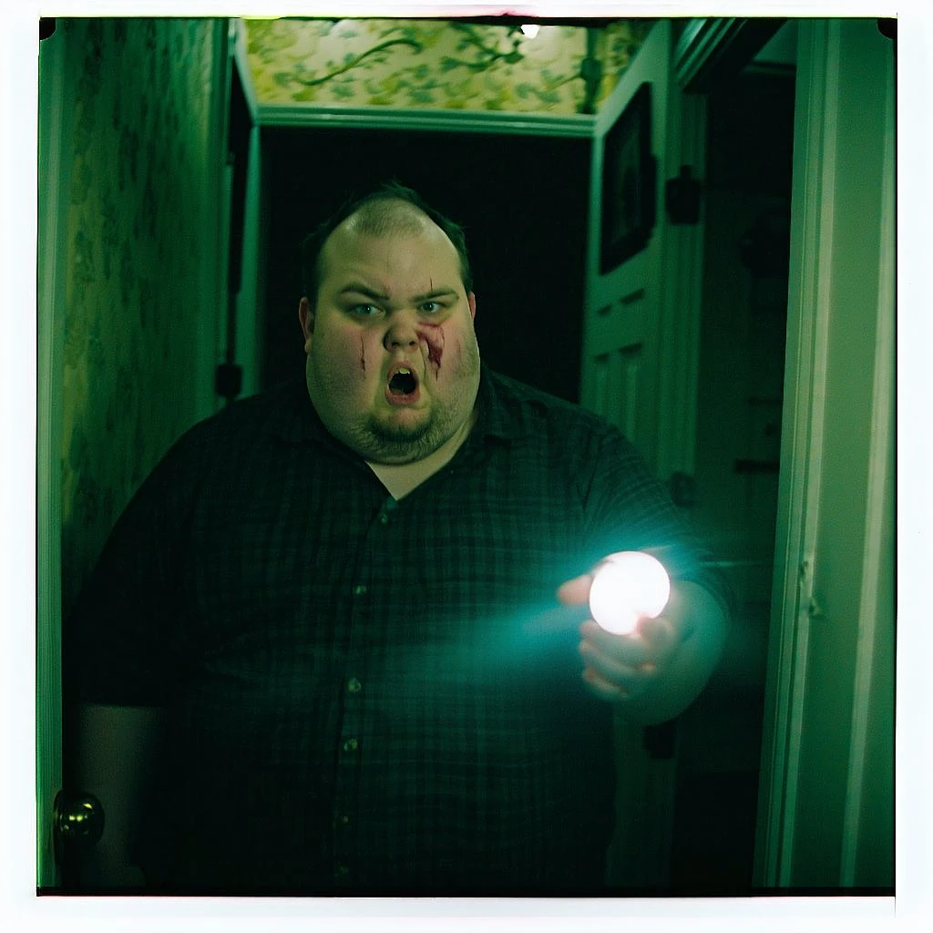 Obese british bloke in a creepy haunted house holding a flashlight and he is scared out of his wits, abandoned, grainy 80's quality polaroid photograph, uncanny, after dark,