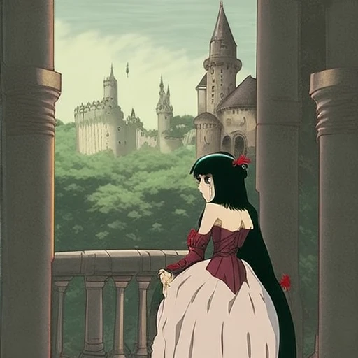foto de gran calidad de una chica gotica anime en estilo retro vintage anime, al estilo de berserk, la chica esta parada mirando a camara con una expresion sadica de felicidad con la lengia afuera mostrando colmillos afilados, hay un castillo gotico de fondo de la epoca media val y es de noche, todo detras de la chica se ve desenfocado.