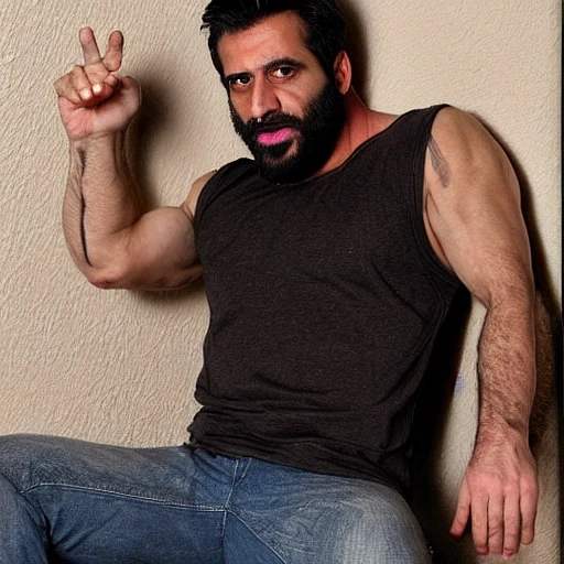 Photo medium shot 1:1 dark haired muscle beast wickedly handsome unshaved! ! 5 o’clock shadow! ! ! beastly hairy mad snarling Iranian giga chad extremely trim goatee very strong nose sneer with a large mole near the nose stretched flaring nostrils very stylish hyper-masculinity hyperrealistic 8k --photo concept art --beta --up beta --poolsuite style --Davide Conti style