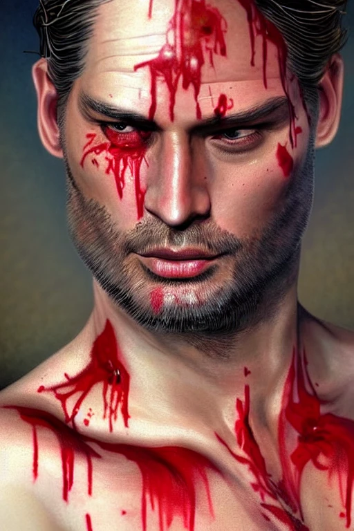 man covered with blood, covered with tattoo, josh holloway face! ! ! , masterpiece portrait, white hair, highly detailed face, ultra realistic, concept art, intricate details, highly detailed, photorealistic, octane render, 8 k, unreal engine. horror film still, heavy grain, 3 5 mm, art by artgerm and greg rutkowski and alphonse mucha