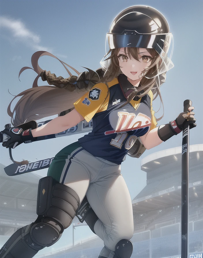 1girl, perfect anime illustration, happy, very closeup painting, dreadlocks, best brown girl hair, brown eyes, woman, team uniform, team logo, number, ice hockey, stadium, hockey puck, dark green, helmet, nhl, hockey skates, team outfit with number, hockey stick, happy, realistic, ice field, gray pants, ice hockey game, aesthetic. best quality, animated lighting, masterpiece, fashion, anime, trending, detailed fanart, anime faces, dynamic pose