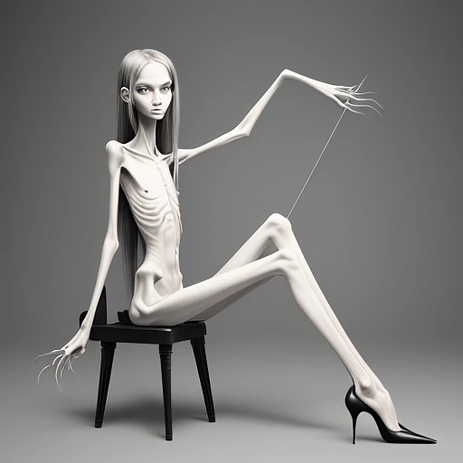 a needle-thin anorexic girl with skinny long legs and long skinny calves in high heels with long hooked claws, naked