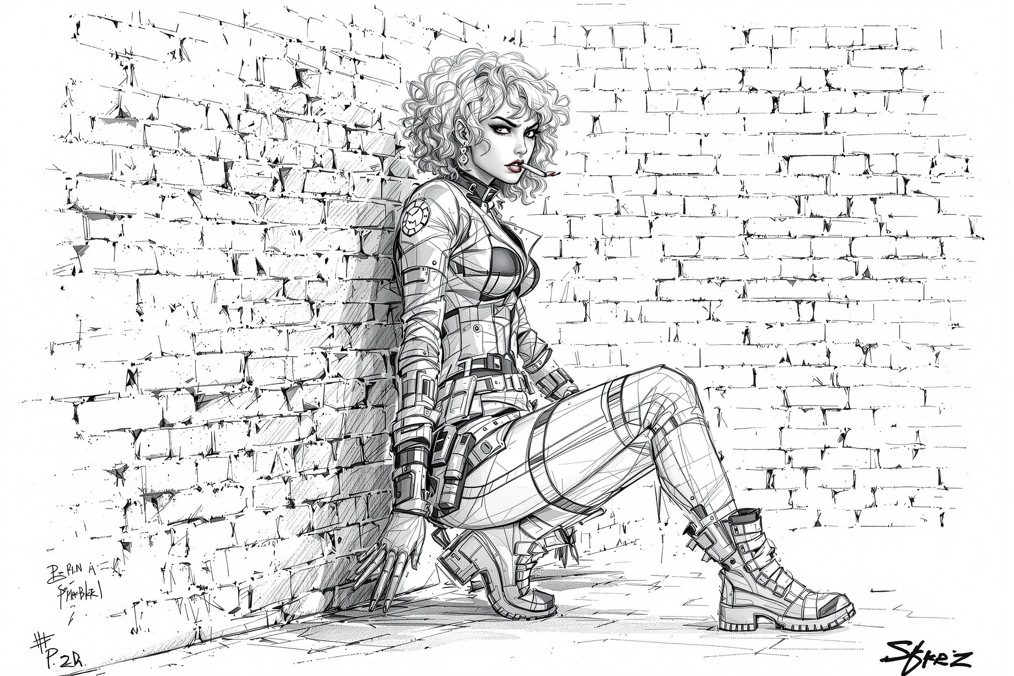 A very well done pencil sketch of a full body cyberpunk female character, around the age of 20 leaning against a brick wall smoking a cigarette and looking away from the camera. They have an angry face. They should be wearing a police outfit and heavy boots and their hair is reminiscent of makima from Chainsaw man, but curly hair. like malin akerman as laurie jupiter
