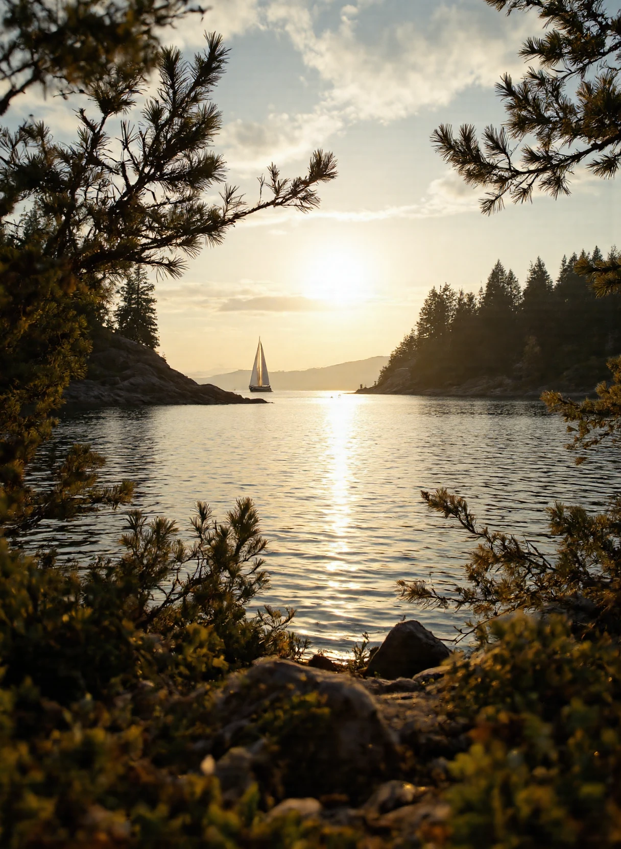 The image depicts a serene lakeside scene during sunset. In the foreground, there are pine tree branches framing the view, their needles silhouetted against the water and sky. The water reflects the warm hues of the setting sun, creating a shimmering effect on its surface. In the middle ground, a sailboat is visible, gliding smoothly across the calm lake. The boat's sails are fully unfurled, catching the light and adding to the tranquil atmosphere. The shoreline in the background features a rocky outcrop with dense trees, likely conifers, which adds depth and texture to the landscape. The sky transitions from a soft yellow near the horizon to a deeper blue higher up, indicating the time of day is either early morning or late evening. The overall composition conveys a sense of peace and natural beauty, capturing a moment of quiet reflection by the water.
