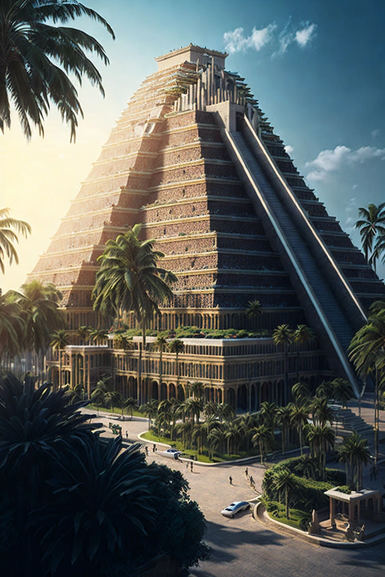 A majestic Great Ziggurat of Ur surrounded by lush palm trees and a bustling cityscape, rendered in a hyperrealistic style with highly detailed textures and cinematic lighting, bathed in the beauty of a bright daylight.