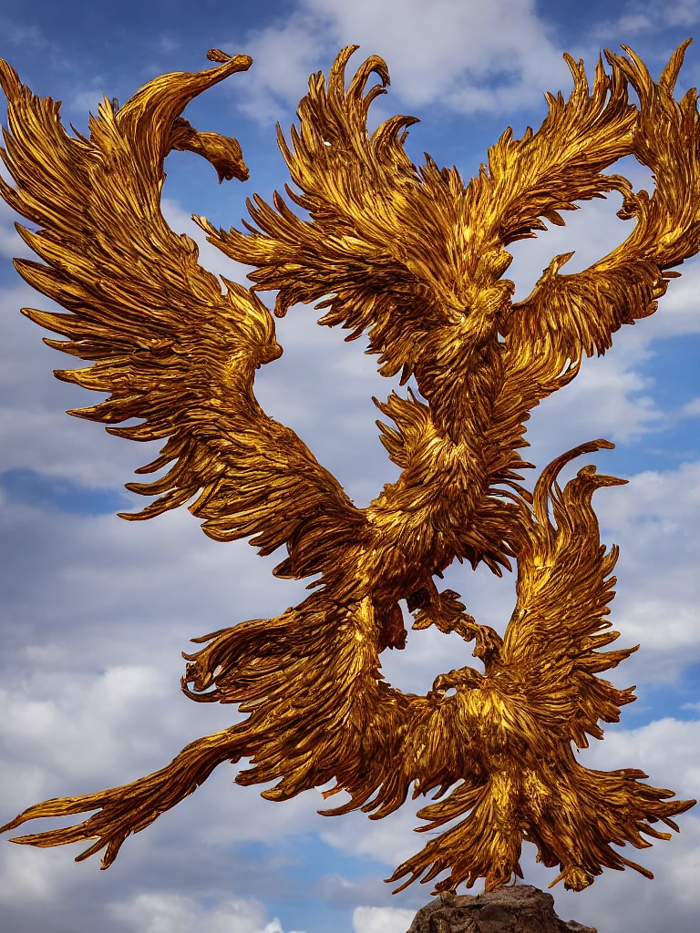 A majestic phoenix with vibrant plumage, its fiery wings spread wide, golden feathers illuminating against a dark sky, perched atop a rugged mountain peak, surrounded by swirling clouds, capturing the phoenix's grace and intensity, Sculpture, bronze casting, 8k high definition --ar 1:1 --v 5