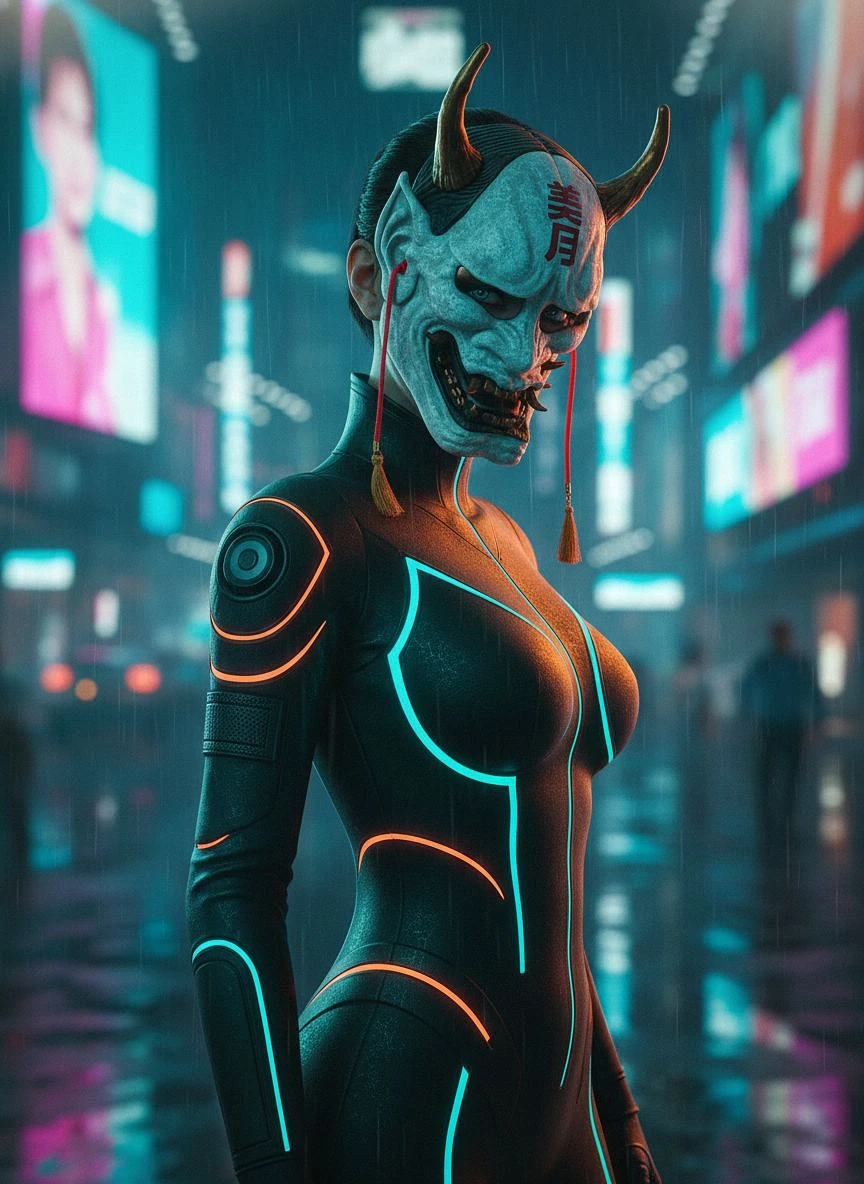 Cyberpunk Tokyo night, confident woman in a sleek techwear bodysuit wearing a futuristic oni mask (white ceramic, subtle patina, gold horns, red tassels, glowing kanji on forehead) , neon rim-light, wet street reflections, holographic billboards, bokeh, rain mist, cinematic portrait 3/4, sharp eyes behind mask slits, high detail, fashion editorial, tasteful, dramatic color contrast teal/orange + magenta accents, OpenJourney style, ultra-detailed, volumetric lighting, depth of field