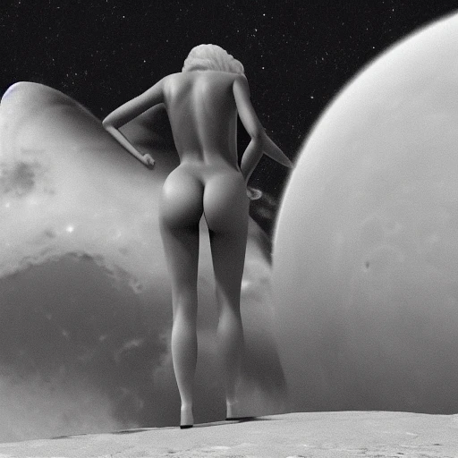 space girl, rear view , beautiful ass , standing on a white moon-type surface, look far away
