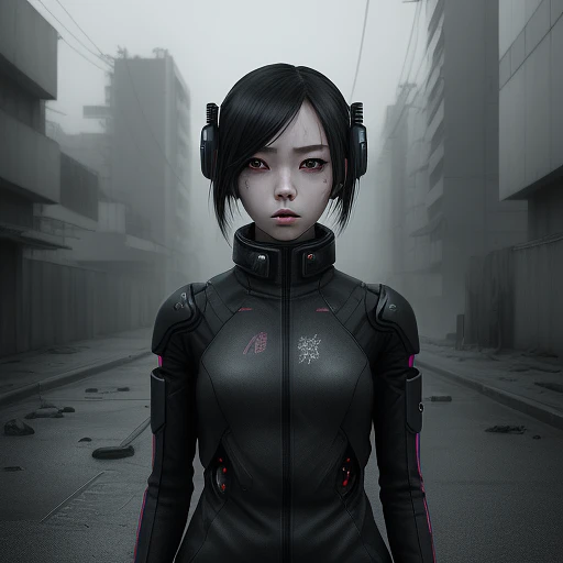 create image of woman, face perfect expressive teenager, style Japanese female android in dystopian attire on a desolate street, overcast, ruins, cinematic, 32k, --ar 9:16 --niji 5 --style expressive
